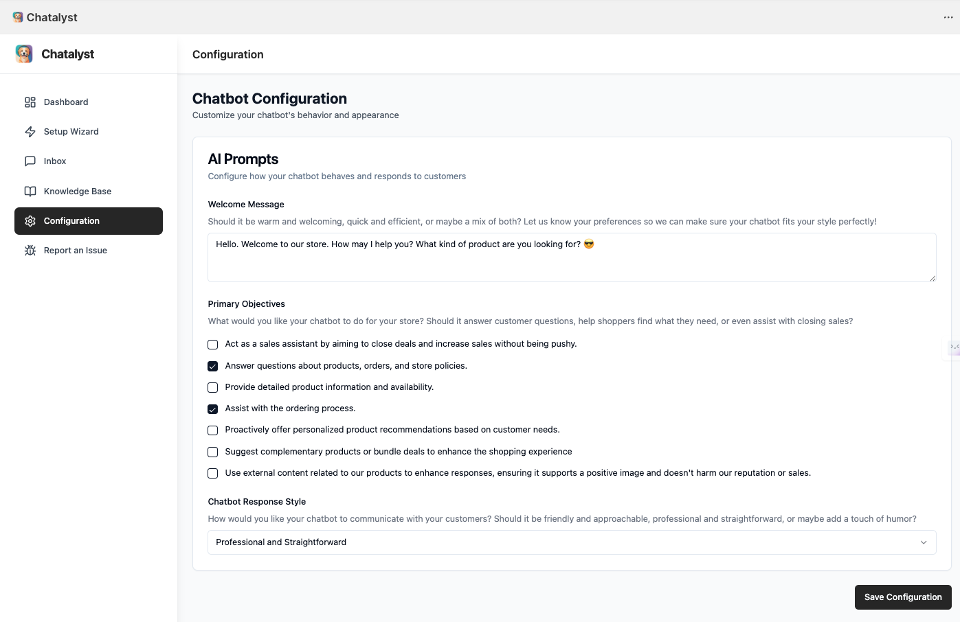 Next, you’ll be directed to the Chatbot Configuration page. This is where you personalize how Chatalyst talks and acts, turning it into an extension of your brand.