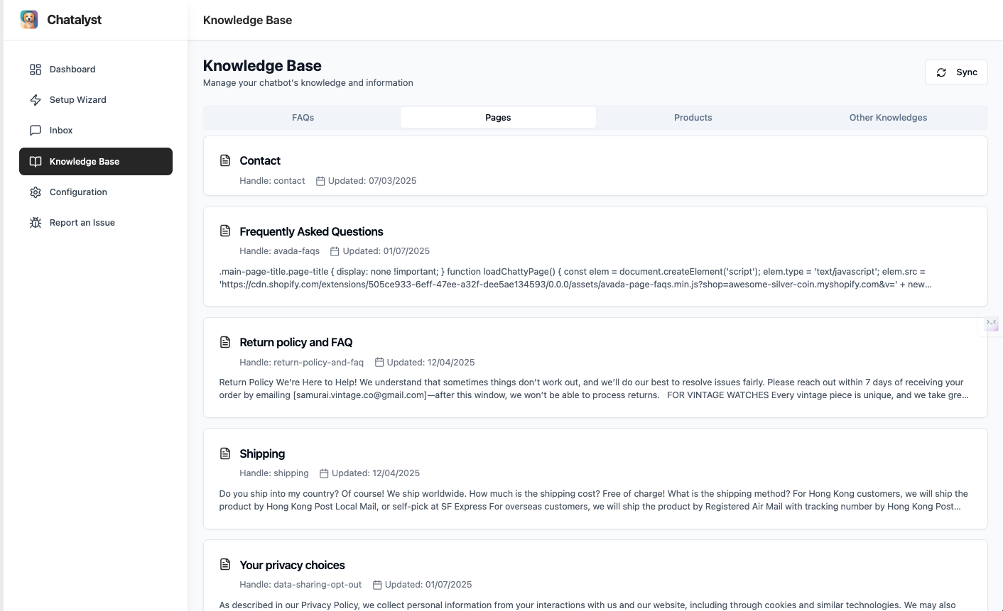 Chatalyst is smart, but it needs your store’s knowledge to shine as your AI sales rep. Head to the Knowledge Base page to sync data and add custom info—it’s like giving your bot a crash course in your business.