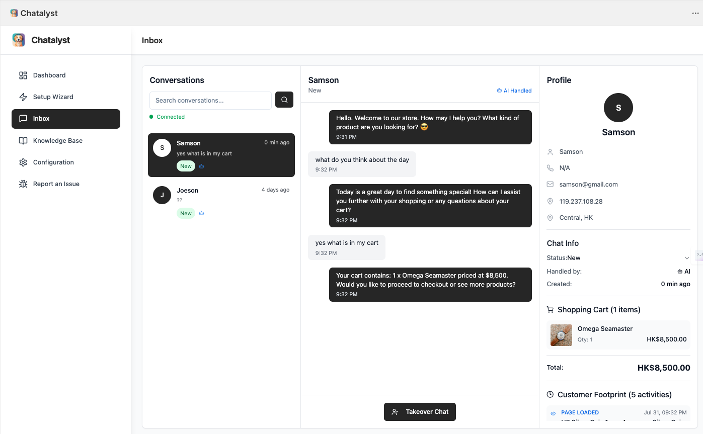 - Click Takeover Chat to go human-mode—you reply directly, and Chatalyst steps back.